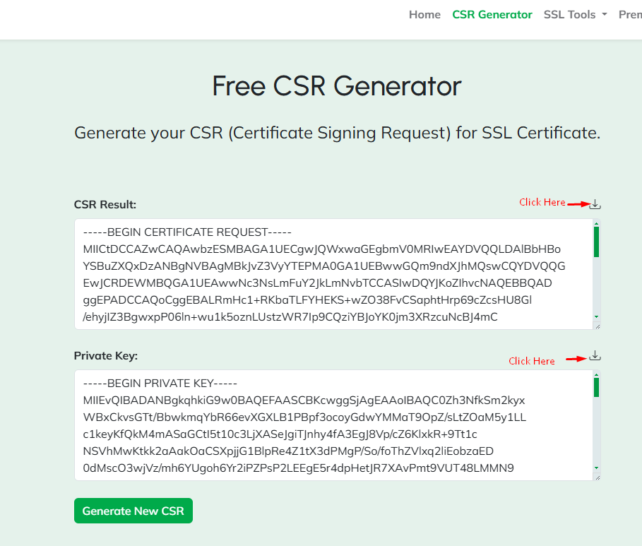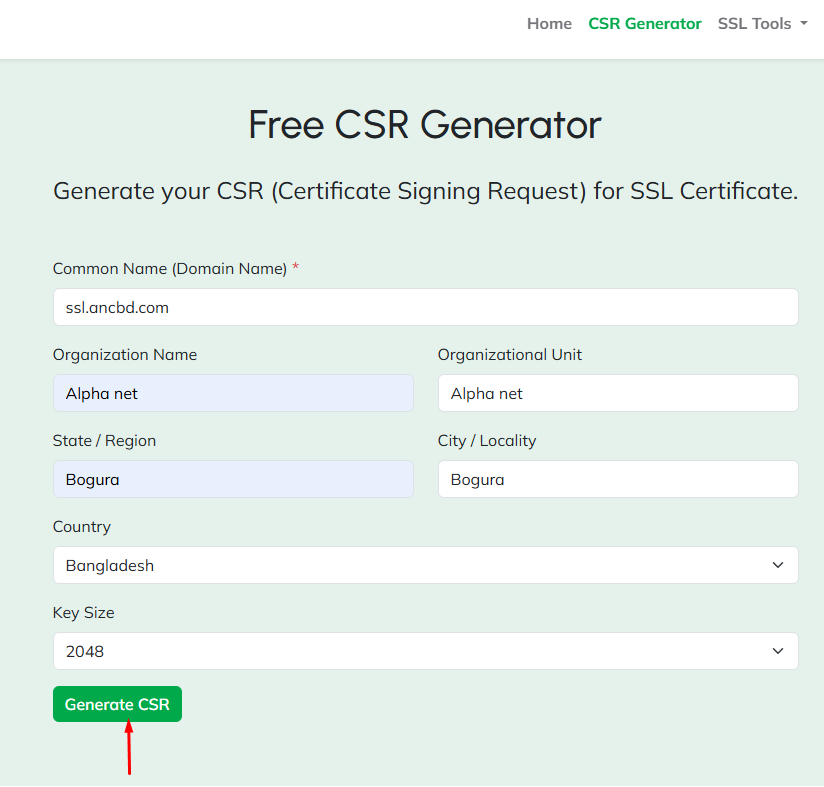 During CSR Generator, Common Name (Your Domain Name), and must use "2048" in the Key Size. After filling out the CSR Generator form, click on the "CSR Generator" button.
