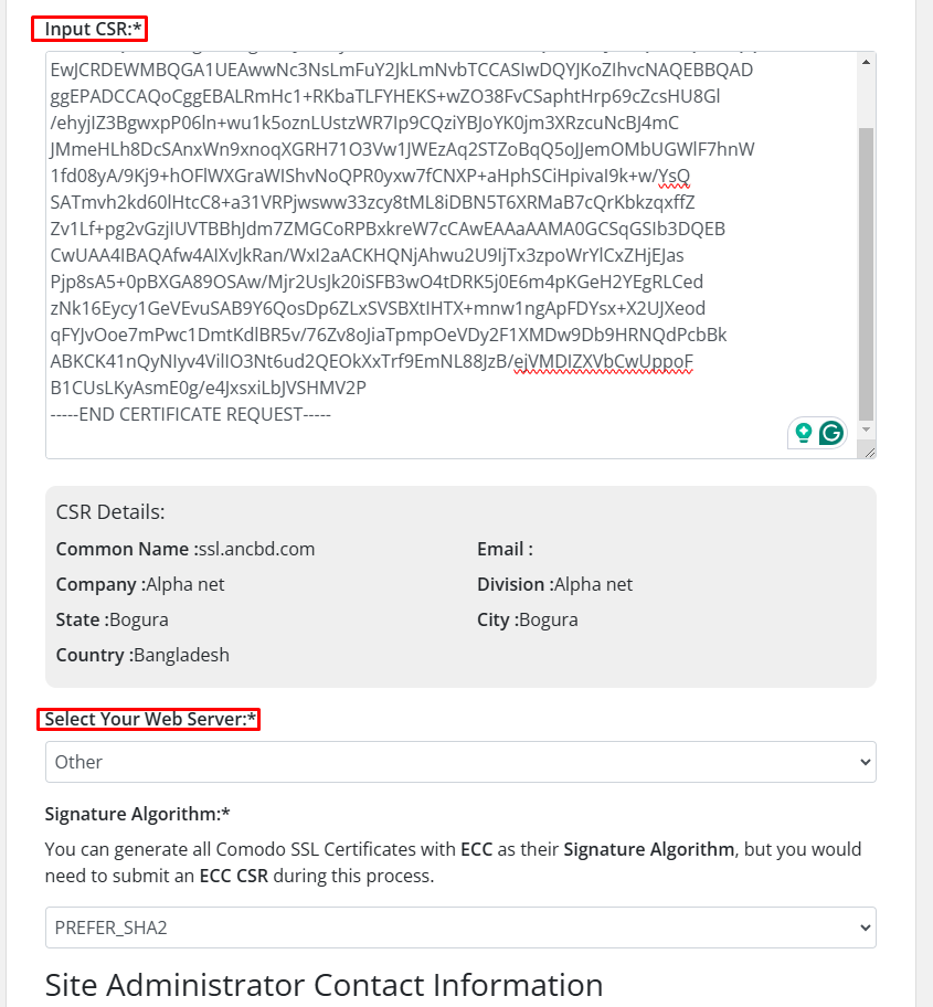 Step 7. Input CSR:* Paste your downloaded CSR file in the blank space. Then select "Select Your Web Server:*" other option.