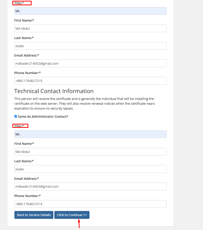 Step 8. Please Set Mr in Title:* and click on the "Click to Continue" button.