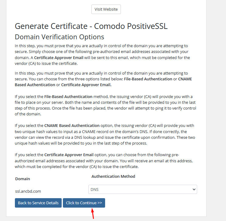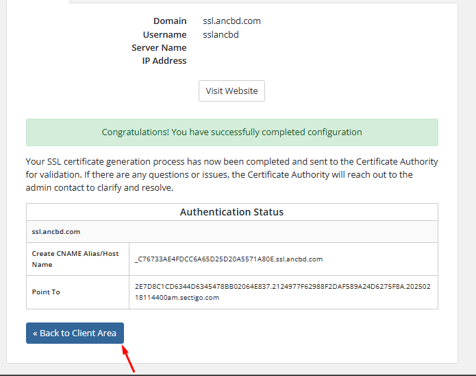 Step 9. After clicking on the Click to Continue button, add the record you get to your domain for SSL Verification. After adding the record, click on the "Back to Client Area" button.