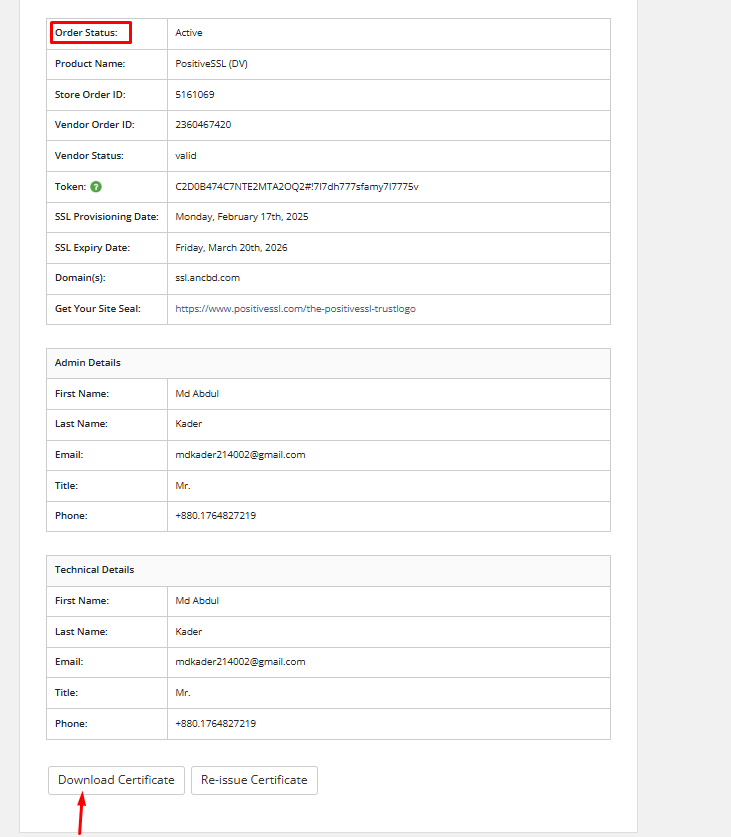 Step 11. After the Order Status: Active, you can download the SSL certificate from "Download Certificate" Option.